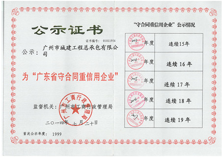 日前,在廣州市工商行政管理局開展的守合同重信用評選活動中,公司連續(xù)19年(1999—2017年)獲得“廣東省守合同重信用企業(yè)”榮譽。