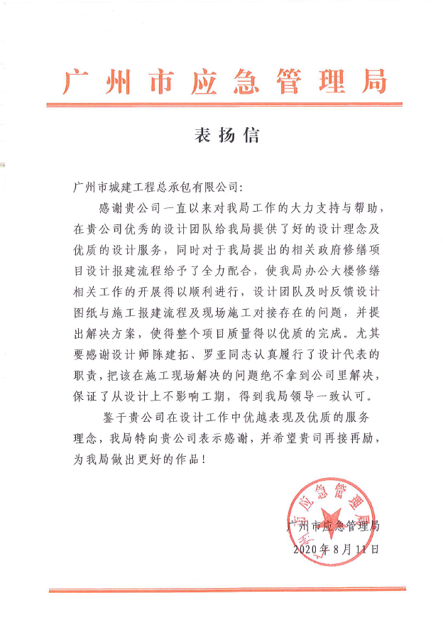8月,廣州市應(yīng)急管理局向我公司發(fā)來表?yè)P(yáng)信,對(duì)我公司為廣州市應(yīng)急管理局建設(shè)工作的支持表示衷心感謝和贊揚(yáng),其中對(duì)設(shè)計(jì)團(tuán)隊(duì)陳建拓、羅亞同志突出的工作表現(xiàn)給予高度評(píng)價(jià)。