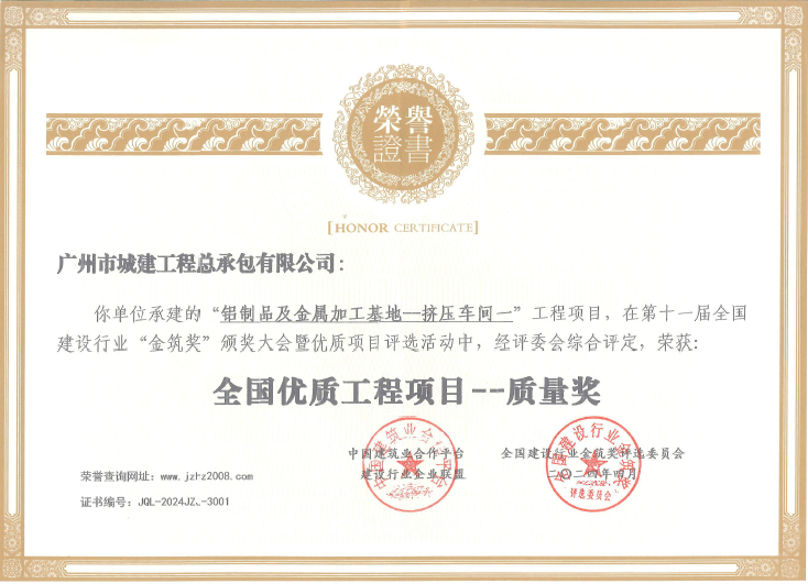4月,公司積極參加全國(guó)建設(shè)行業(yè)“金筑獎(jiǎng)”評(píng)選活動(dòng),經(jīng)綜合評(píng)定,由公司承建的新興鳳鋁公司鋁制品及金屬加工基地--擠壓車(chē)間一工程項(xiàng)目榮獲第十一屆“金筑獎(jiǎng)”全國(guó)優(yōu)質(zhì)工程項(xiàng)目——質(zhì)量獎(jiǎng)。