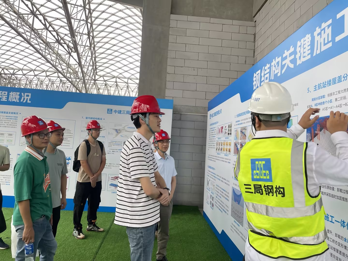 本次觀摩是中建三局廣州白云國際機場三期擴建工程項目T3航站樓工程,項目設(shè)計新穎,總建筑面積69.32萬㎡,建筑高度42.95米,航站樓地上4層,局部5-6層,地下1層,局部2層,主體為鋼筋混凝土框架、屋蓋采用預(yù)應(yīng)力網(wǎng)架+桁架結(jié)構(gòu),作為亞洲最大的機場擴建工程,建成后將與T1、T2一起運行年旅客吞吐量世界第一。
