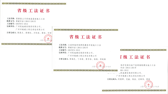 2013年4月,我公司與廣州機施集團合作完成的《弱膨脹土天然地基基礎施工關鍵技術研究》、《大面積鋼網架群機整體吊裝施工關鍵技術研究》及《地鐵保護范圍內地下連續(xù)墻銑槽法施工關鍵技術研》三項工法取...