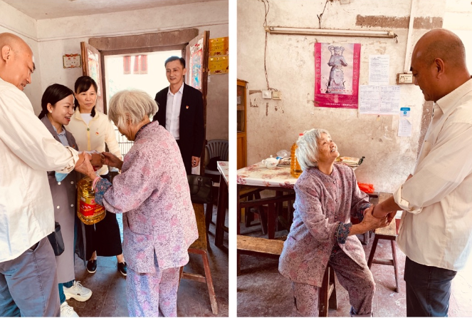 我們到78歲的萬錦英老人家去慰問,她緊緊拉著院駐村扶貧干部蔡慶立同志的手,眼里充滿了感激之情。
