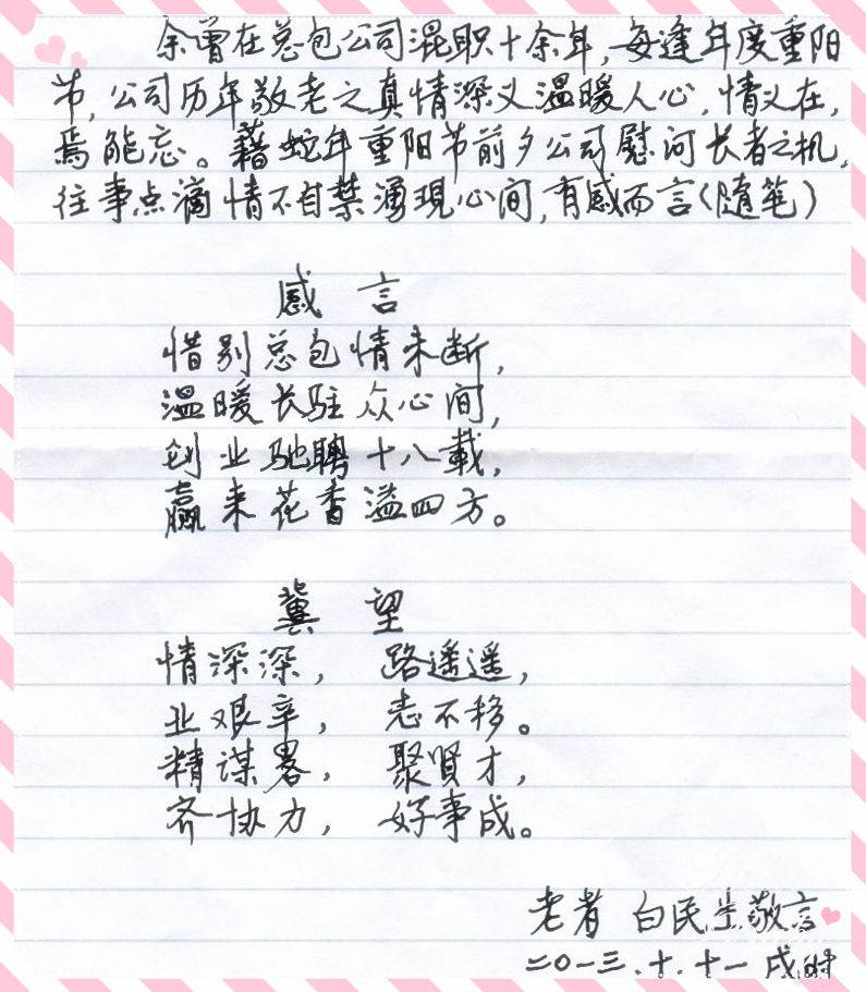 感言:惜別總包情未斷,溫暖長(zhǎng)駐眾心間,創(chuàng)業(yè)馳騁十八載,贏來(lái)花香溢四方。